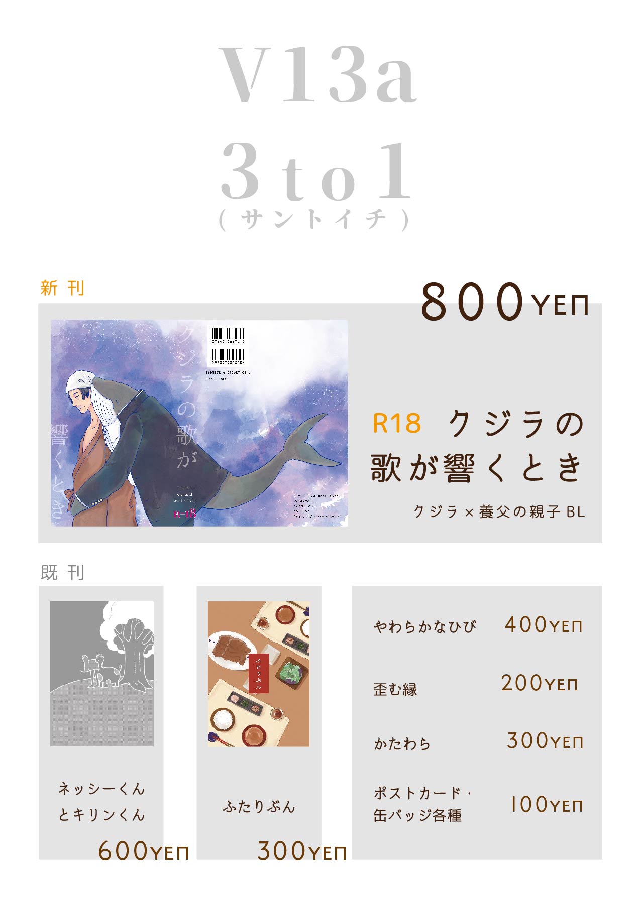つぎのコミティアはもう何度かここでも書いているかもしれませんが脚の生えたクジラ×養父のBLの予定です。当サークルの創作本初のR18になると思います。ハッピーエンドにしたいのですがいきなりオレもお前がすきだったそしてキラキラトーンからの両思い超ハッピーじゃん?!みたいにはならないと思います。
